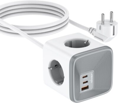 Ciabatta multipresa 7 in 1 con 4 prese AC 4000W 16A, 2 USB‑C e 1 USB‑A. Eroga 33W PD per ricaricare telefoni e tablet. Il cavo 1,5 m agevola il posizionamento su scrivania o a terra. Il formato a cubo riduce l’ingombro vicino al muro.