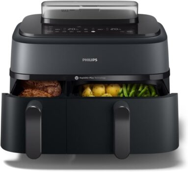 La Philips Airfryer Serie 5000 da 9 litri ha doppio cestello con vapore e RapidAir Plus. Hai 19 modalità tra aria calda, vapore, combinato, forno, griglia e arrosto. Il cassetto è 6 L per piatti principali, il secondo è 3 L per contorni. Cuoce 1100 g di patatine, 1600 g di verdure o un pollo da 1,2 kg. La pulizia a vapore scioglie i residui in pochi minuti.