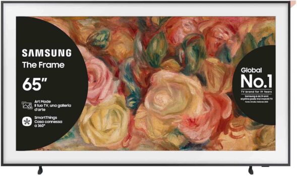 Samsung The Frame 65 pollici QLED 4K con Quantum Processor 4K ottimizza immagine e suono. Il Matte Display riduce i riflessi. La Art Mode mostra opere d’arte a TV spenta. Design Frame con cornici opzionali. Dolby Atmos e Q‑Symphony migliorano l’audio con soundbar compatibili. Tuner DVB‑T2 integrato. Alexa integrata, compatibile con Bixby e Google Assistant. Smart Hub e Gaming Hub per contenuti e cloud gaming. Classe energetica G.