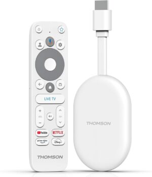 Il THOMSON Go Cast 150 porta Google TV 4K UHD su qualsiasi TV con HDMI. Supporta Dolby Atmos e Dolby Digital+ con app compatibili. La memoria integra 2 GB SDRAM e 8 GB per app. Il telecomando ha Google Assistant e tasti rapidi. Googlecast invia contenuti da telefono e laptop. L’alimentatore multipresa facilita l’uso su ciabatte affollate.