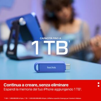 La SanDisk USB Type C 256 GB espande lo spazio di smartphone, tablet e computer compatibili. Raggiunge fino a 150 MB/s in lettura per trasferimenti rapidi. L’app SanDisk per iPhone e iPad gestisce backup automatico di foto e video. Il colore Maritime Blue aiuta a riconoscerla in borsa o zaino.